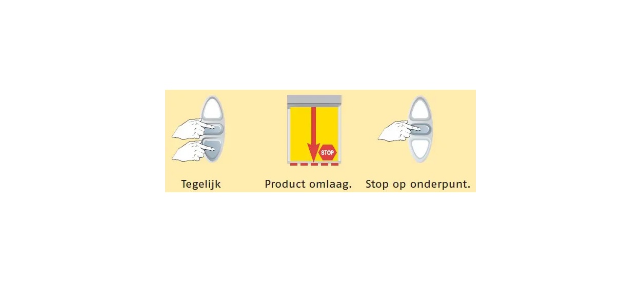 Als de knop “omhoog” wordt ingedrukt gaat het rolluik omhoog. Zet het rolluik in de hoogste positie. Doe dit door de bovenste knop ingedrukt te houden. Druk vervolgens de middelste en onderste knop van de zender tegelijk in (zie afbeelding). Het rolluik daalt nu automatisch naar beneden. Laat op het onderste punt het rolluik stoppen door de middelste knop in te drukken. Met de knop omhoog en omlaag het laagste punt zonodig bijregelen.