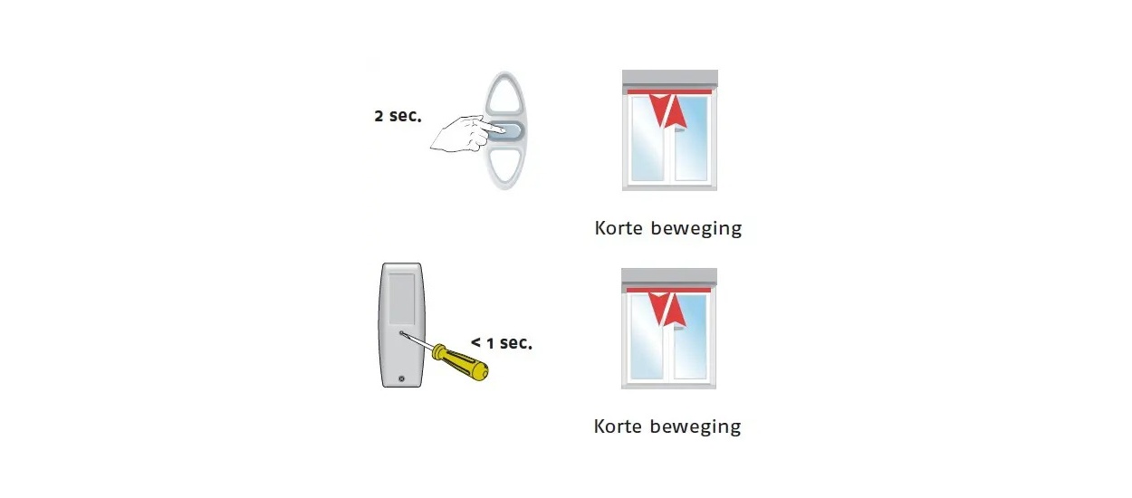 Sluit de motor aan op de netspanning en druk op de zender de bovenste en de onderste knop tegelijk in (zie afbeelding). Direct na deze handeling zal het rolluik kort op en neer gaan.